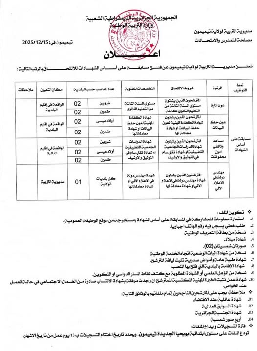 مديرية التربية لولاية تيميمون عن فتح مسابقة على أساس الشهادات