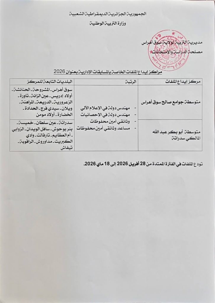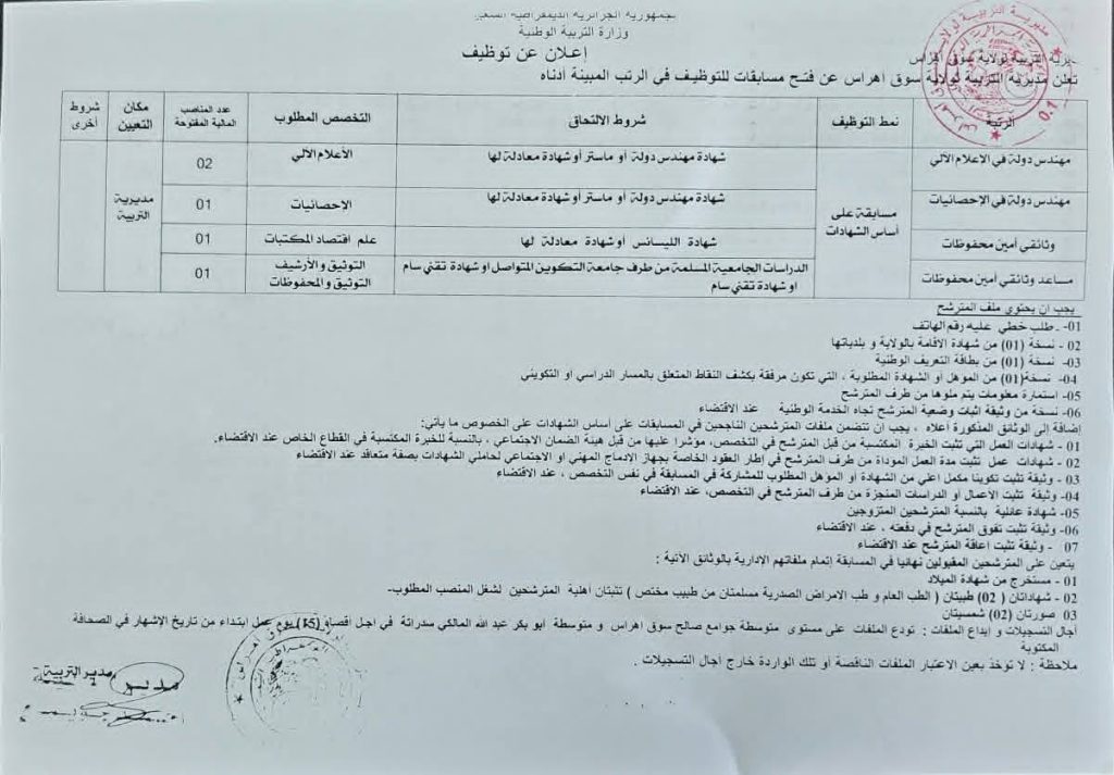 تعلن مديرية التربية لولاية سوق أهراس عن فتح مسابقات للتوظيف في الرتب المبينة أدناه