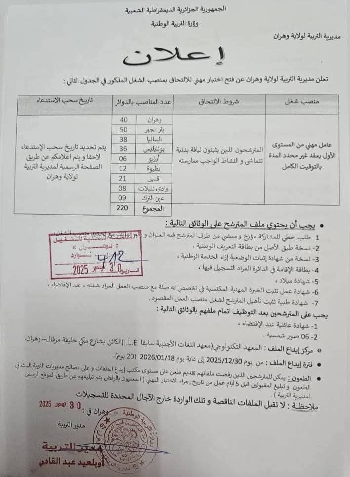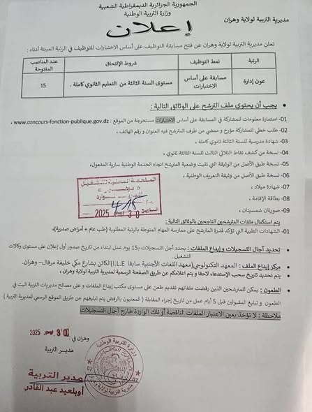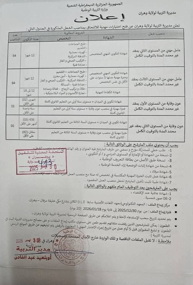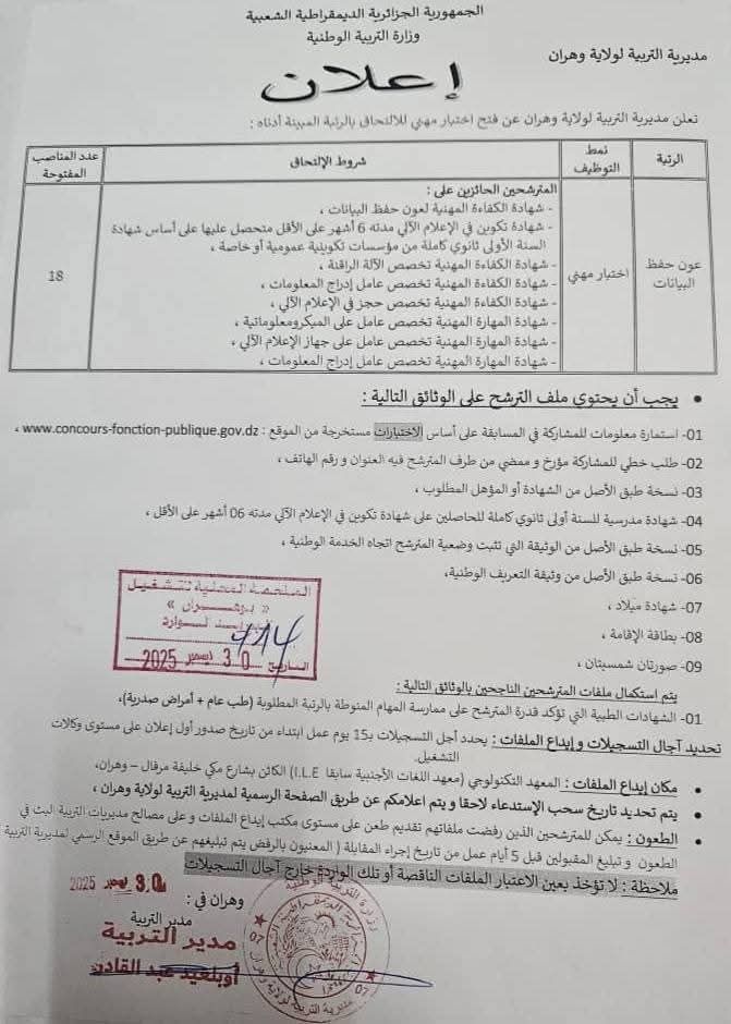 تعلن مديرية التربية لولاية وهران عن فتح مسابقات واختبارات مهنية للتوظيف بعنوان سنة 2025–2026، للالتحاق بالرتب والمناصب المبينة أدناه: