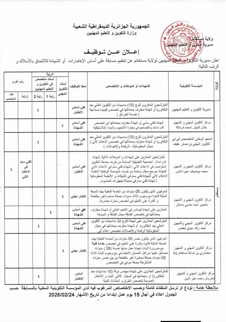 مديرية التكوين والتعليم المهنيين لولاية مستغانم تعلن عن تنظيم مسابقة