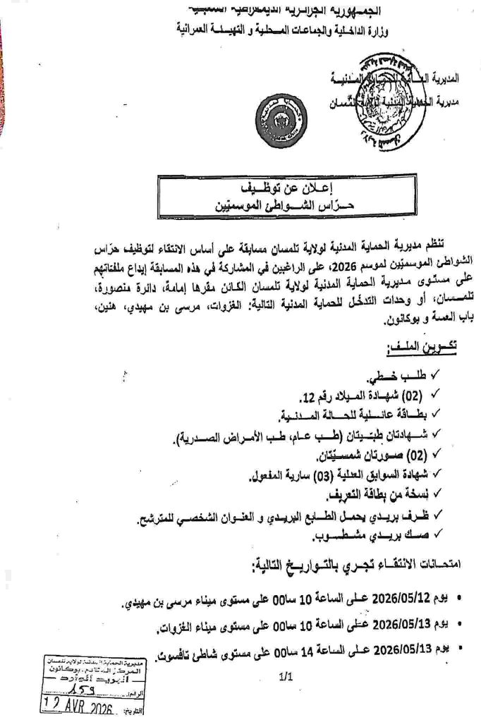 م مديرية الحماية المدنية لولاية تلمسان مسابقة على أساس الانتقاء لتوظيف حراس الشواطئ الموسميين لموسم 2026، على الراغبين في المشاركة في هذه المسابقة إيداع ملفاتهم على مستوى مديرية الحماية المدنية لولاية تلمسان الكائن مقرها إمامة، دائرة منصورة، تلمسان، أو وحدات التدخل للحماية المدنية التالية: الغزوات، مرسى بن مهيدي، هنين، باب العسة و بوكانون.