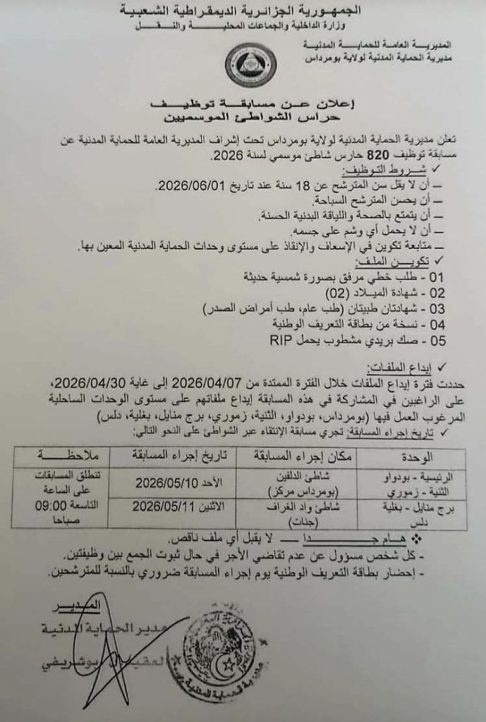 تعلن مديرية الحماية المدنية لولاية بومرداس تحت إشراف المديرية العامة للحماية المدنية عن مسابقة توظيف 820 حارس شاطئ موسمي لسنة 2026.