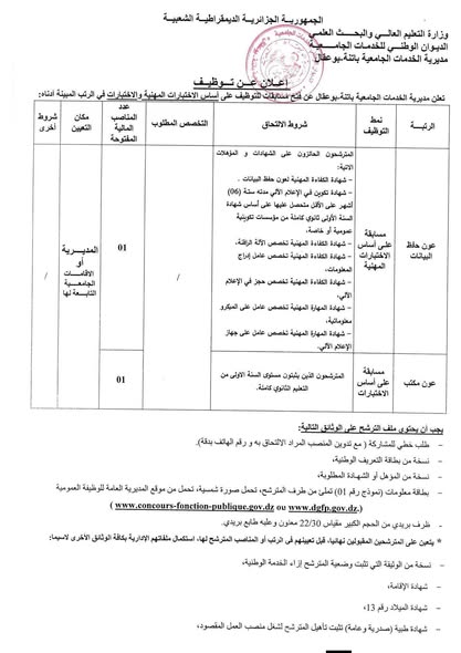 مديرية الخدمات الجامعية باتنة بوعقال تعلن عن فتح مسابقات للتوظيف