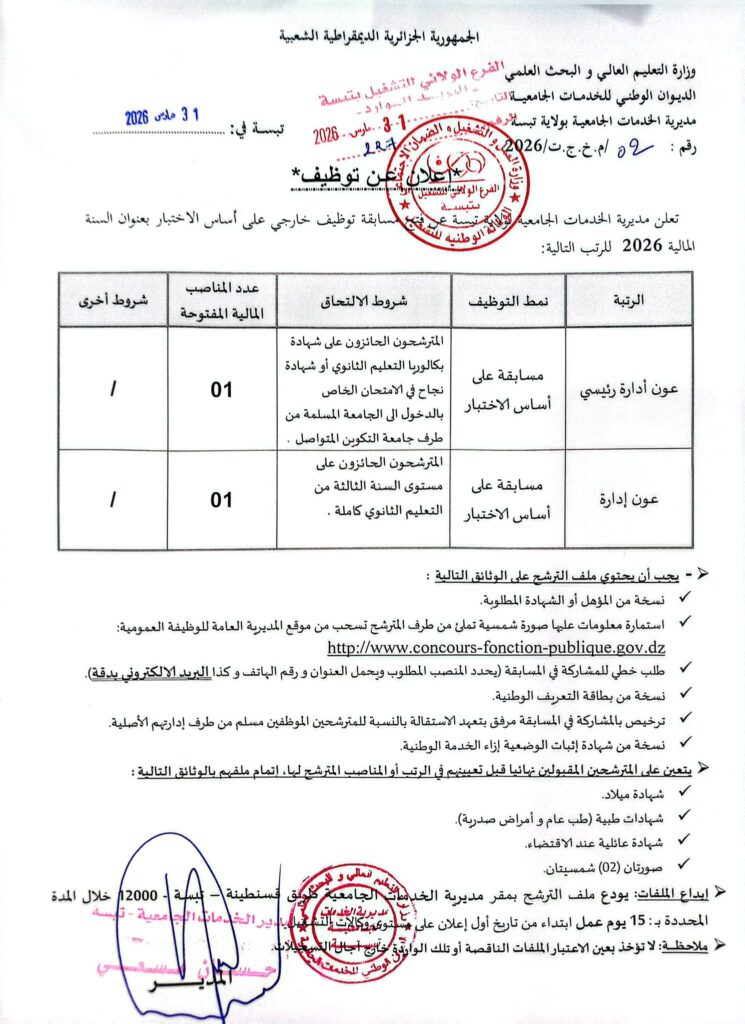 تعلن مديرية الخدمات الجامعية بتبسة عن فتح مسابقة توظيف خارجي على أساس الاختبار بعنوان السنة المالية 2026 للرتب التالية: