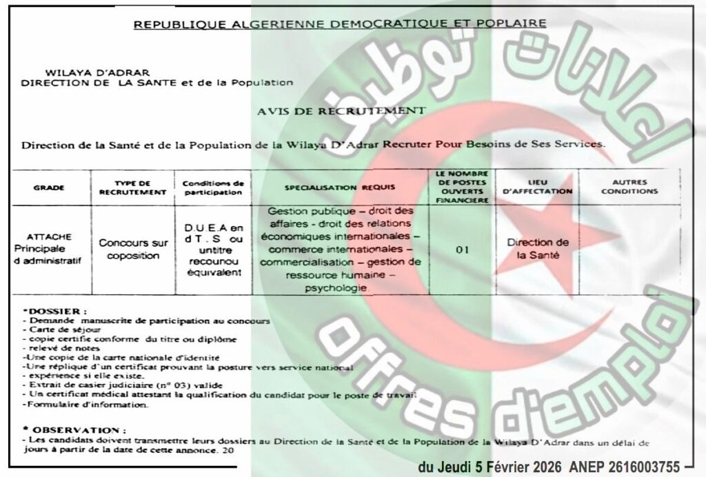 ملحق رئيسي للإدارة (Attaché Principale d’administratif) مسابقة على أساس الاختبارات شهادة الدراسات الجامعية التطبيقية (D.U.E.A) أو شهادة تقني سامي (T.S) أو شهادة معترف بمعادلتها التسيير العمومي – قانون الأعمال – قانون العلاقات الاقتصادية الدولية – التجارة الدولية – التسويق – تسيير الموارد البشرية – علم النفس 01 مديرية الصحة