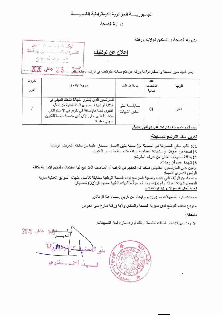 يعلن السيد مدير الصحة و السكان لولاية ورقلة عن فتح مسابقة للتوظيف في الرتب المبينة أدناه: