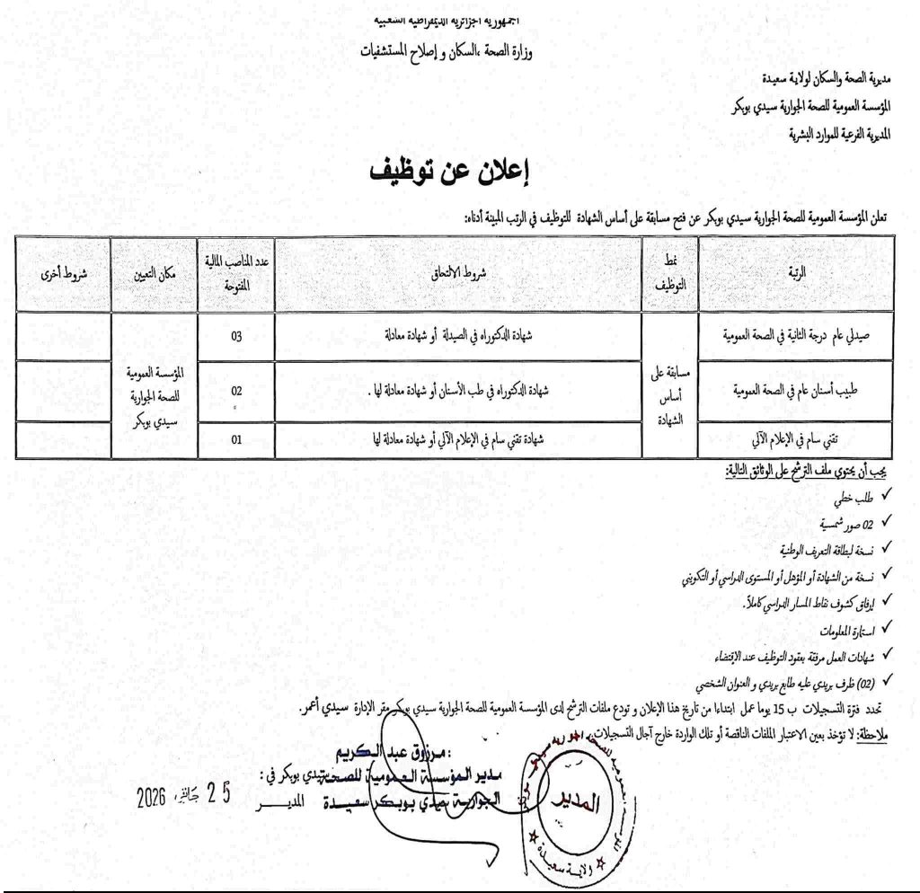 تعلن المؤسسة العمومية للصحة الجوارية سيدي بوبكر عن فتح مسابقة على أساس الشهادة للتوظيف في الرتب المبينة أدناه: