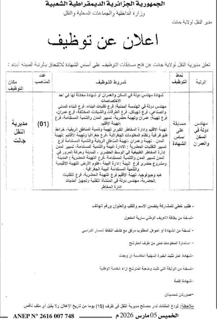 تعلن مديرية النقل لولاية جانت عن فتح مسابقات التوظيف على أساس الشهادة للالتحاق بالرتبة المبينة أدناه: