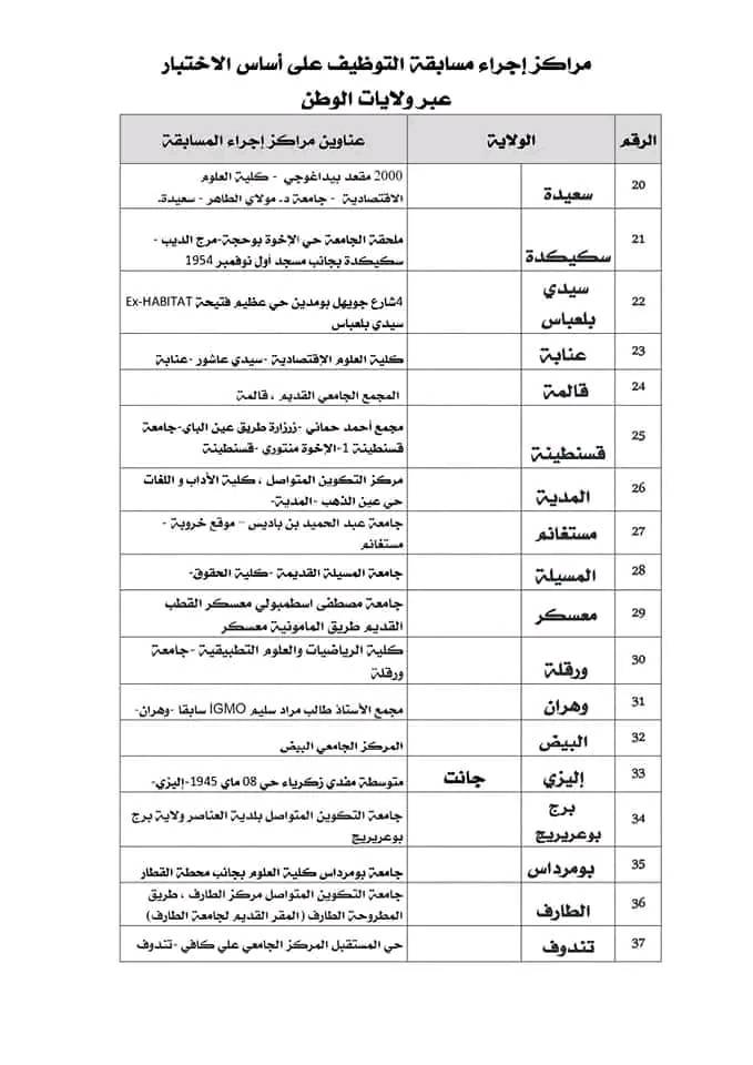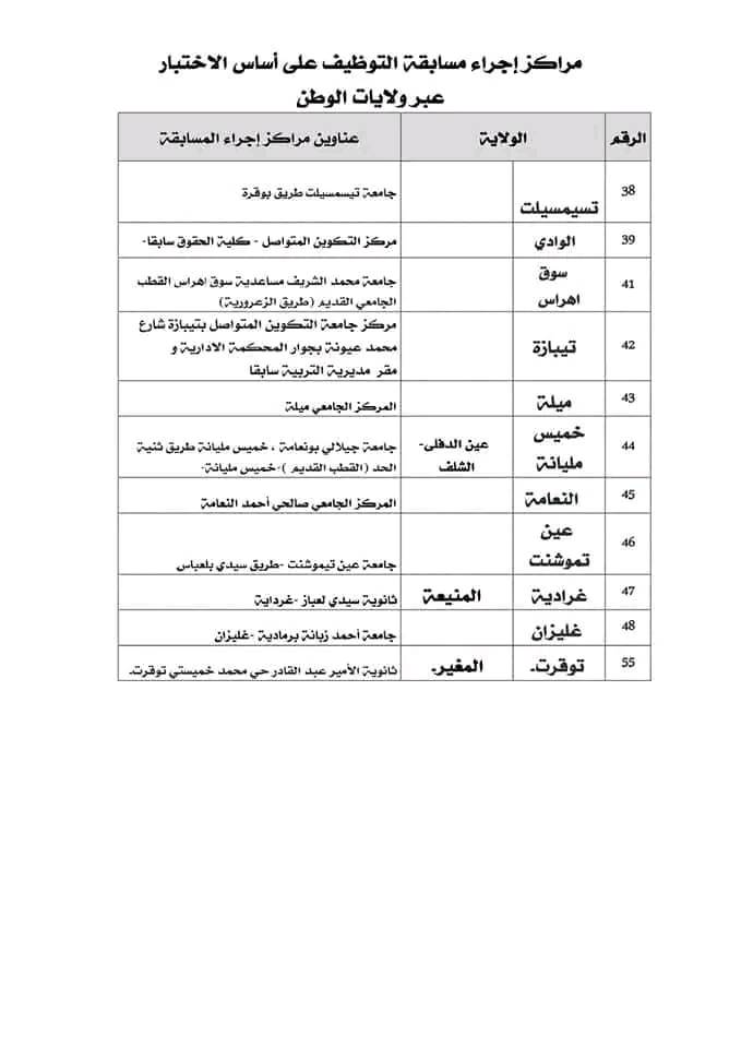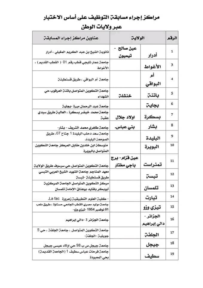 لاجتياز المسابقة على أساس الاختبار، في المراكز الجامعية المذكورة في الرابط أسفله حسب الولاية، وهذا حسب الرزنامة الآتية: