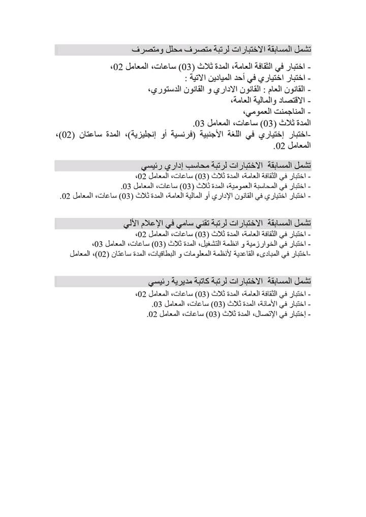 تتضمن المسابقة اختبارات في المواد المذكورة في الرابط المذكور وهذا حسب الرتب.