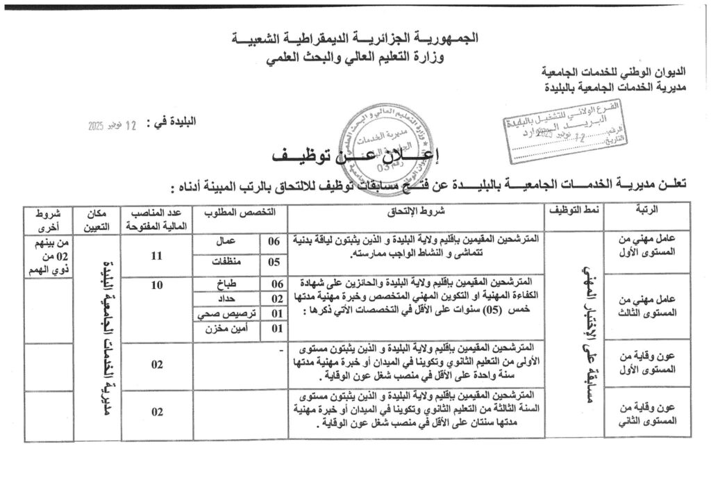 | عامل مهني من المستوى الأول | على أساس الإختبار المهني | المترشحين المقيمين بإقليم ولاية البليدة والذين يثبتون لياقة بدنية تتماشى والنشاط الواجب ممارسته. | عمال: 06، منظفات: 05 | 11 | مديرية الخدمات الجامعية بالبليدة | من بينهم 02 من ذوي الهمم |