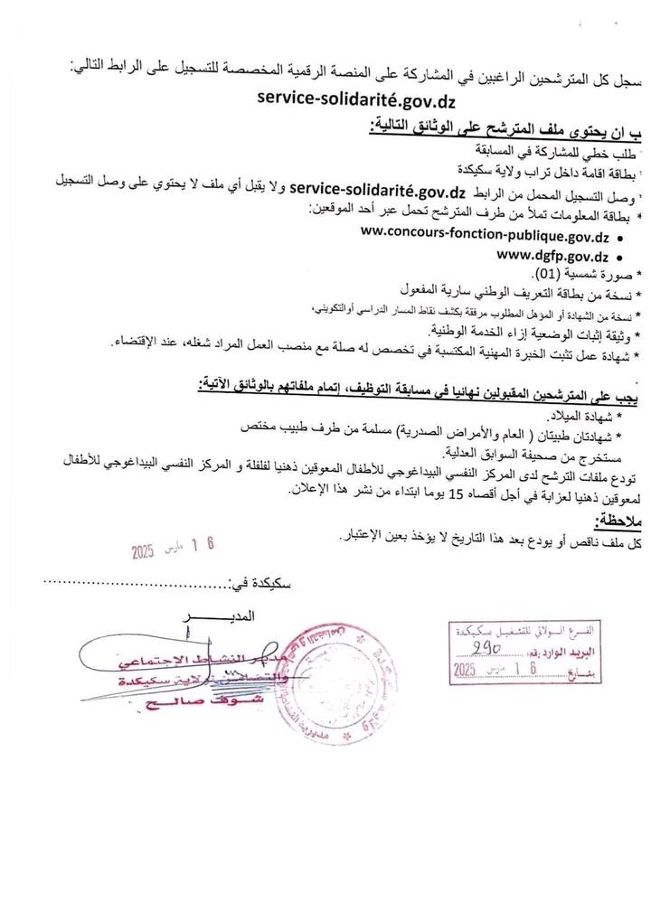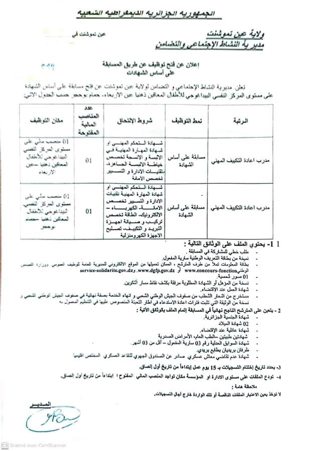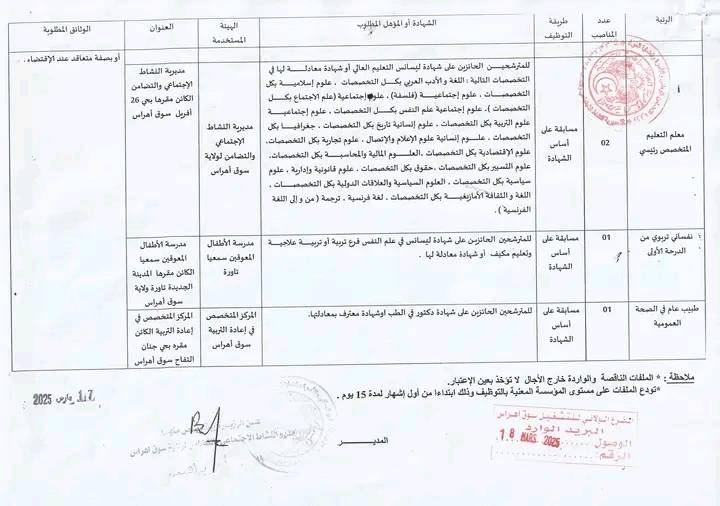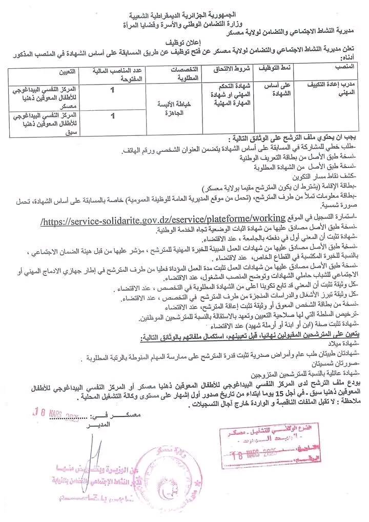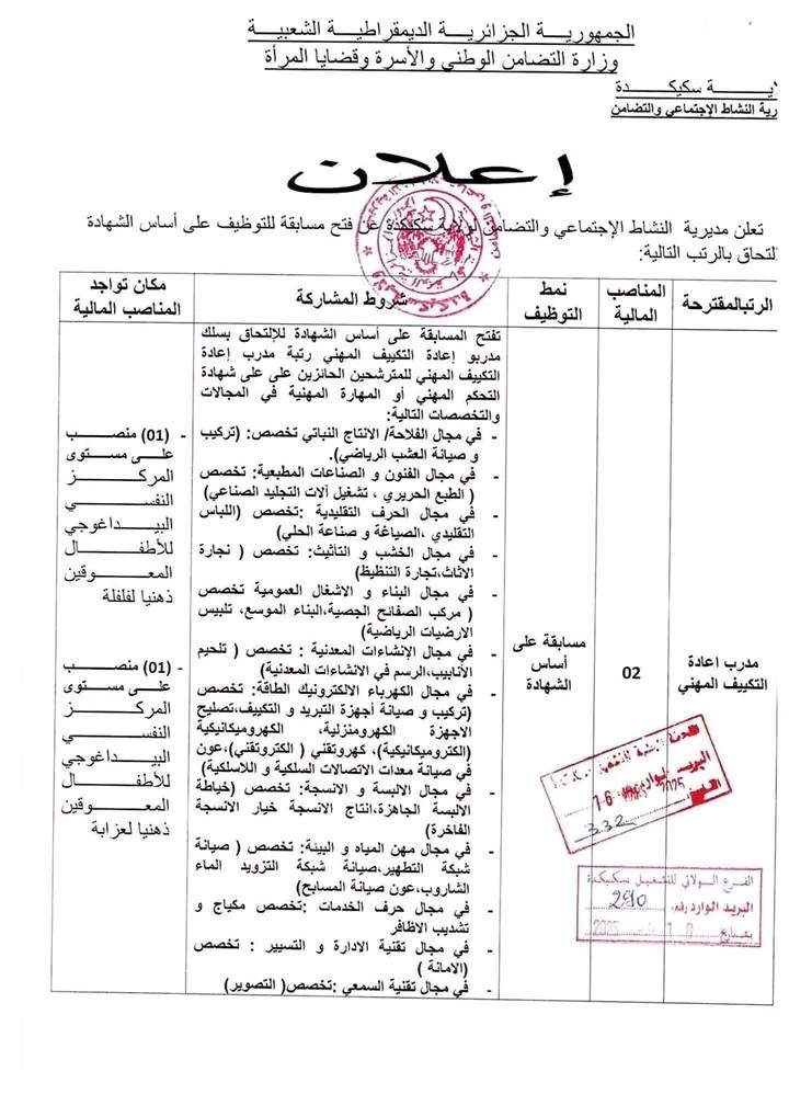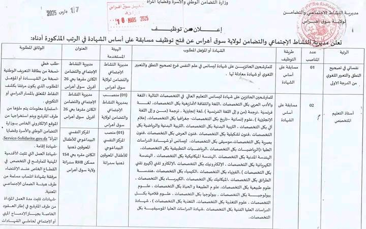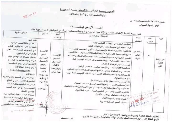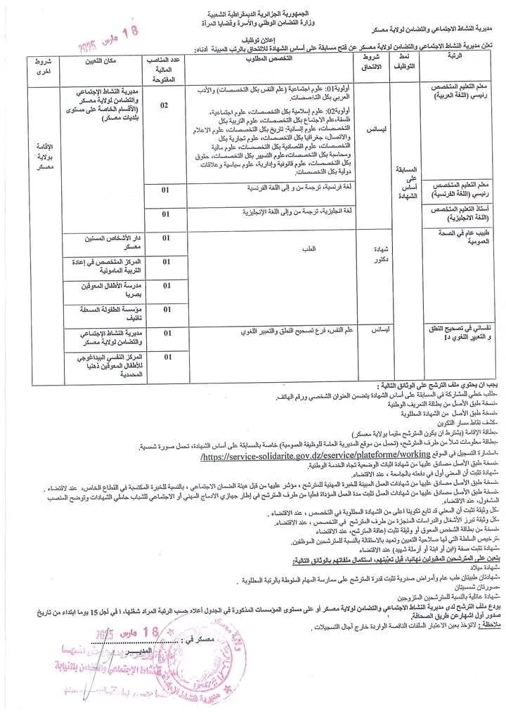 تعلن مديرية النشاط الاجتماعي والتضامن لولايات معسكر.عين تموشنت.سوق أهراس.سكيكدة عن فتح توظيف عن طريق المسابقة على أساس الشهادة في المناصب مذكورة