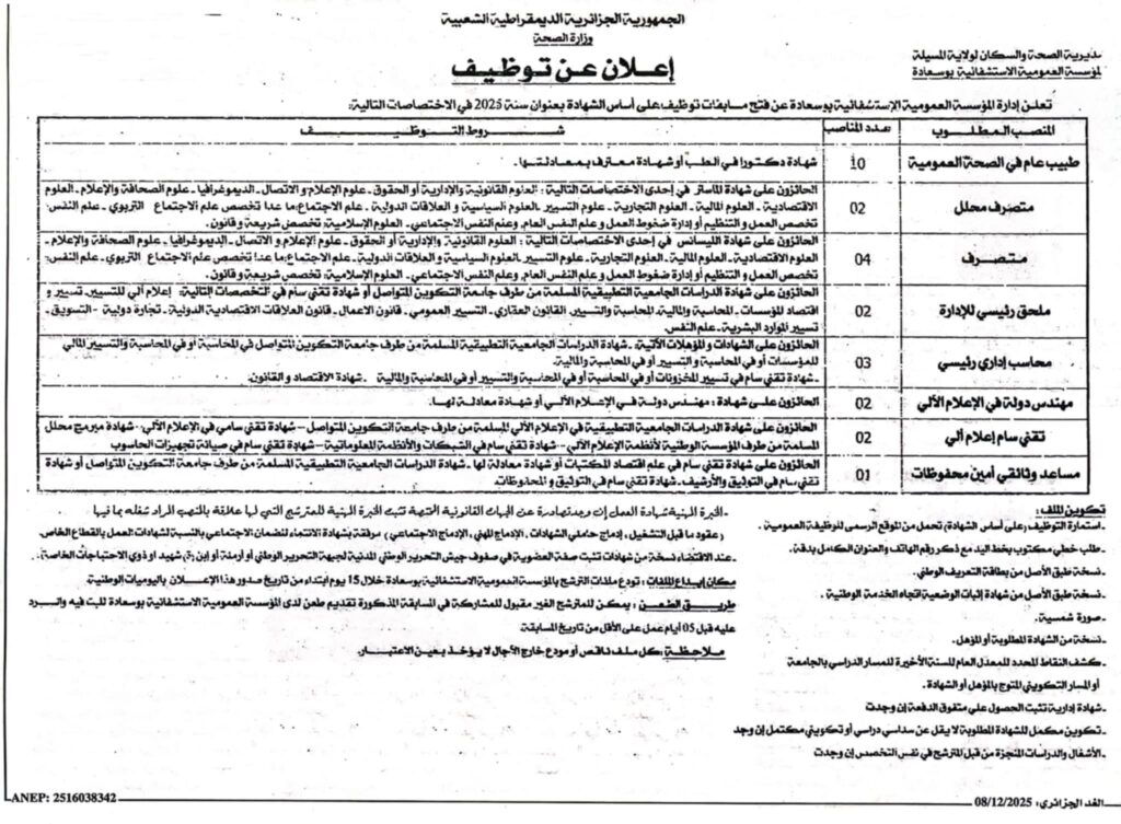 • تُودع الملفات بالمؤسسة العمومية الاستشفائية بوسعادة خلال 15 يومًا ابتداءً من تاريخ صدور الإعلان في اليوميات الوطنية.