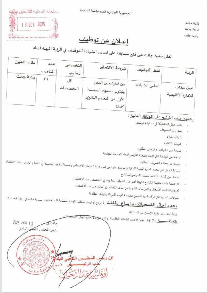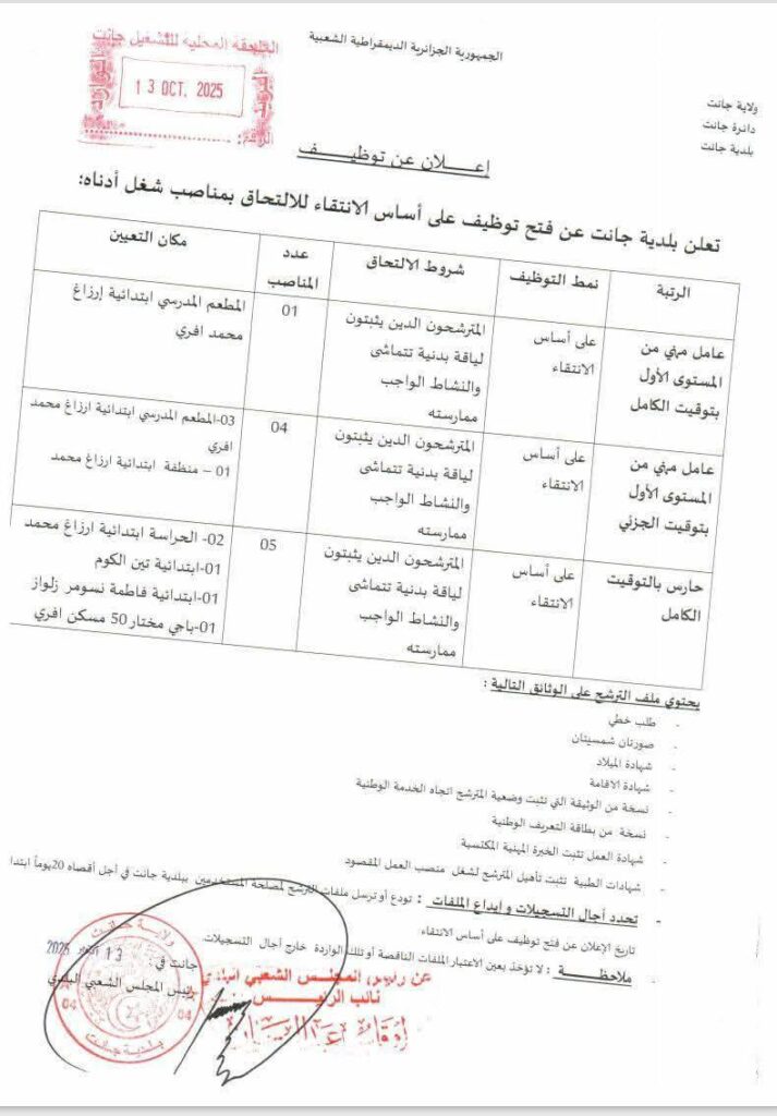 تعلن بلدية جانت عن فتح مسابقة توظيف على أساس الانتقاء للاتحاق بالرتب التالية