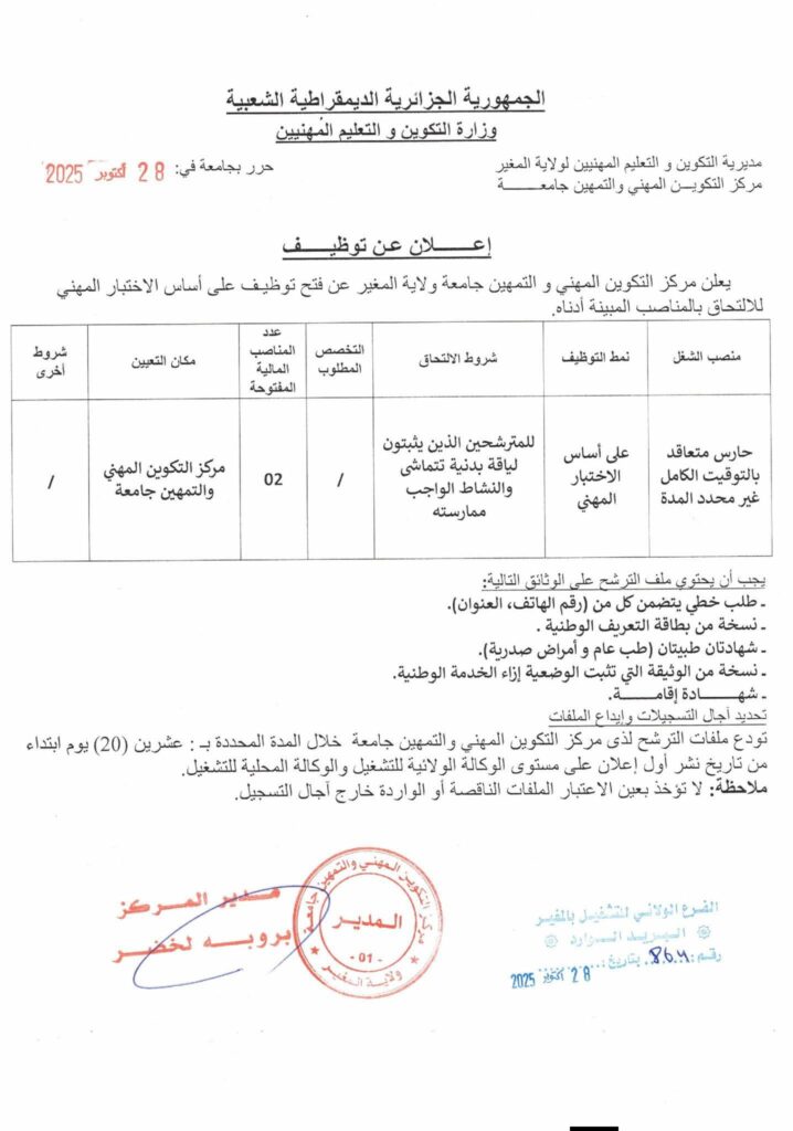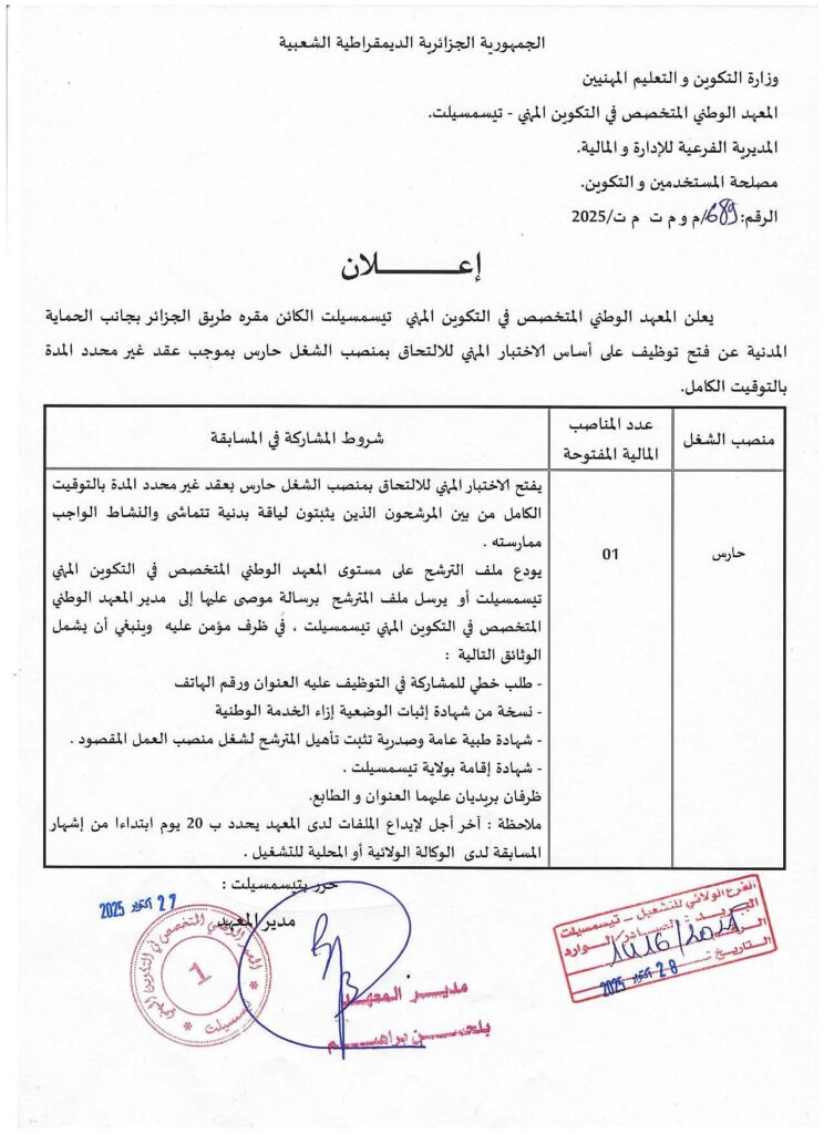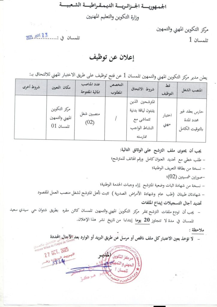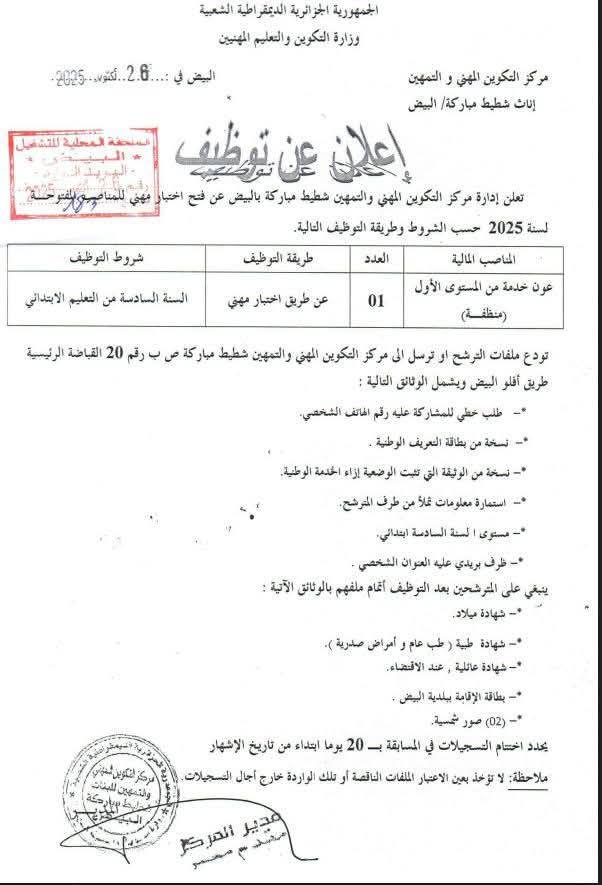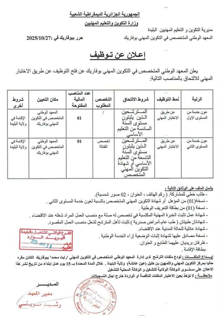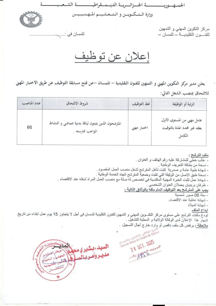 تعلن مديريات التكوين المهني والتهمين لولاية تيسميلت.المغير.تلمسان.البليدة.البيض عن فتح مسابقات توظيف على أساس الامتحان المهني