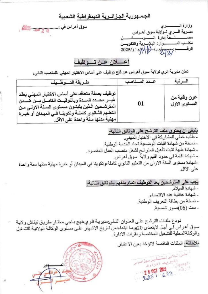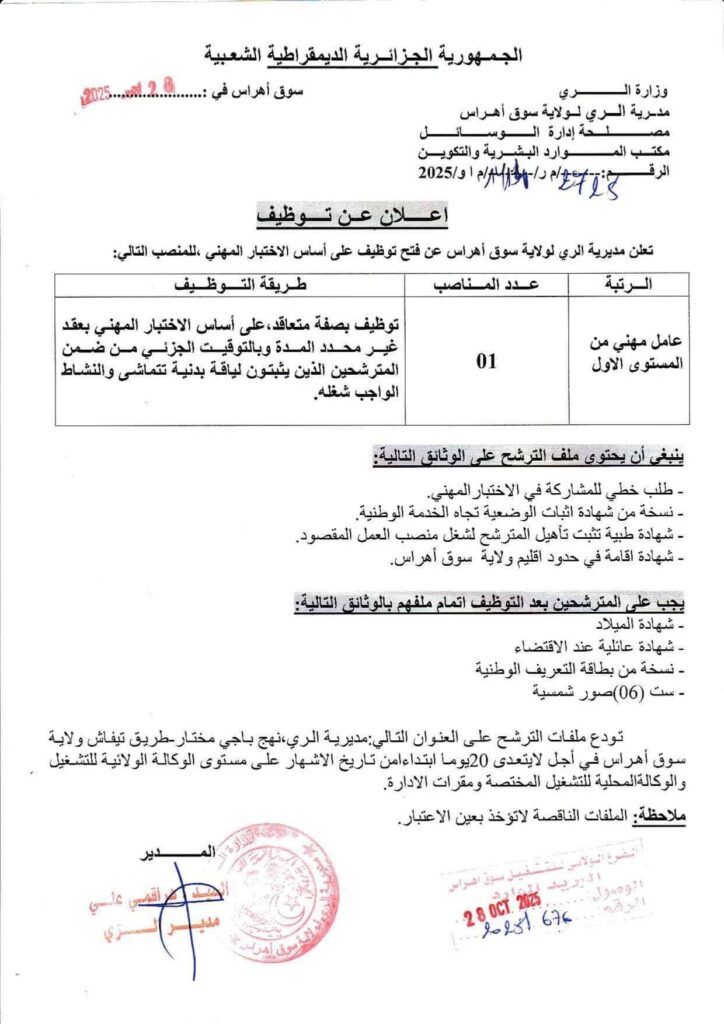 تعلن مديرية الري لولاية سوق اهراس عن فتح مسابقة توظيف على اساس الاختبار المهني للالتحاق بالرتب التالية