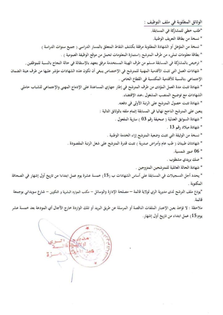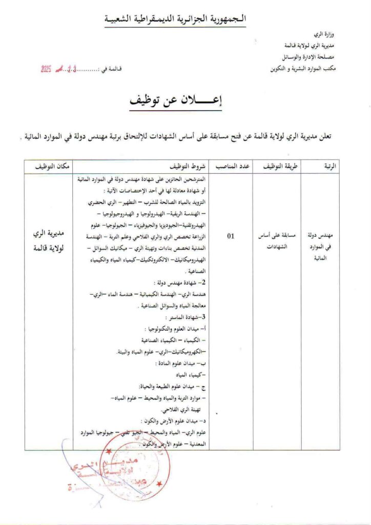 تعلن مديرية الري لولاية قالمة عن فتح مسابقة توظيف على اساس الشهادات للالتحاق بالرتب التالية