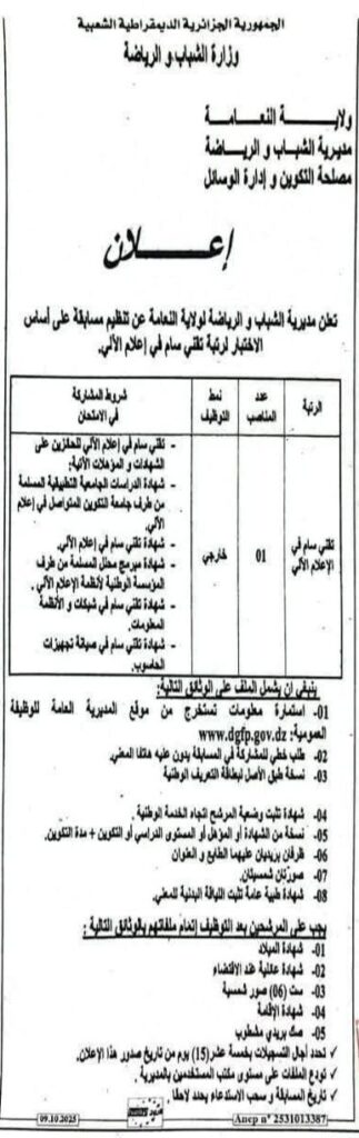 تعلن مديرية الشباب والرياضة لولاية النعامة عن تنظيم مسابقة على أساس الاختبار لرتبة تقني سام في الإعلام الآلي.