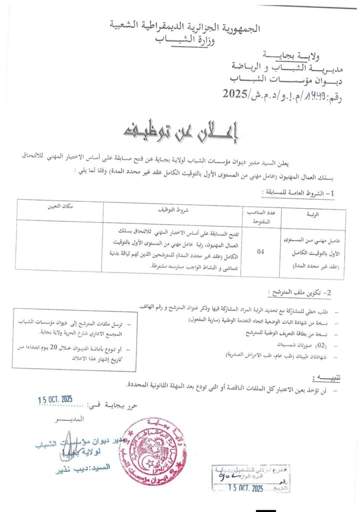 يعلن مدير ديوان مؤسسات الشباب لولاية بجاية عن فتح مسابقة على أساس الاختبار المهني للالتحاق بسلك العمال المهنيين،
