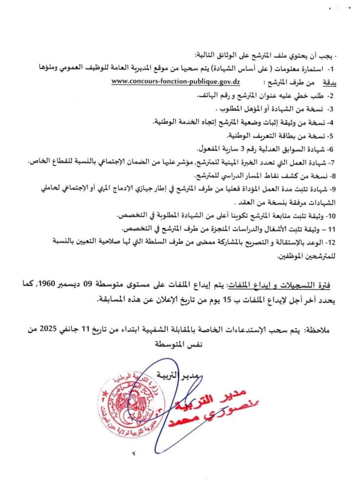 تعلن مديرية التربية لولاية تيارت.عين تيموشنت عن فتح مسابقات توظيف للالتحاق بالرتب التالية