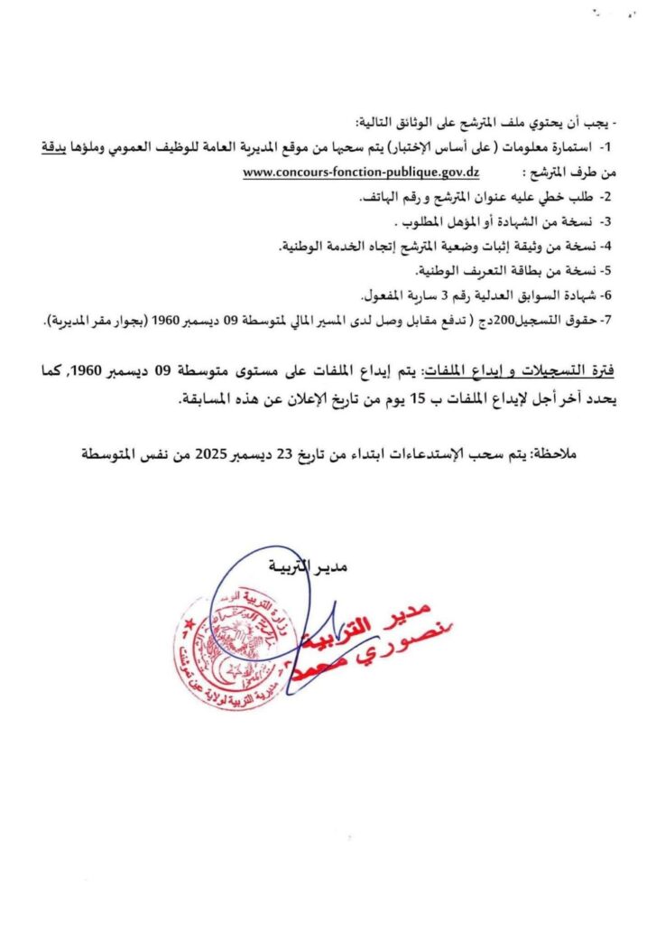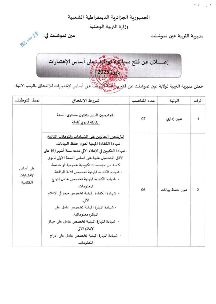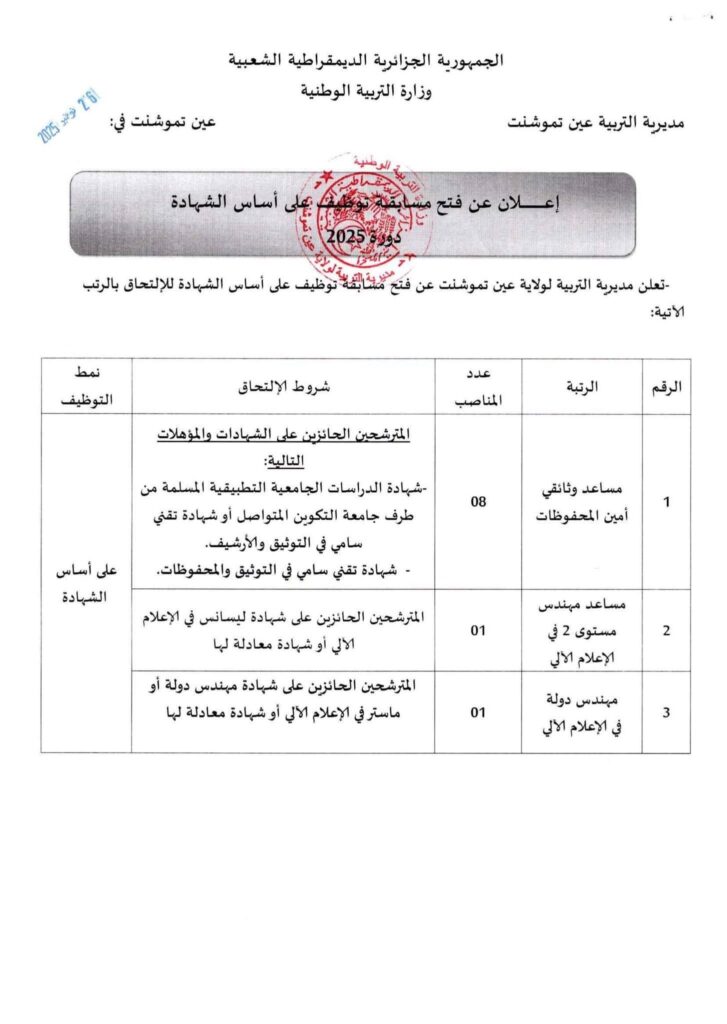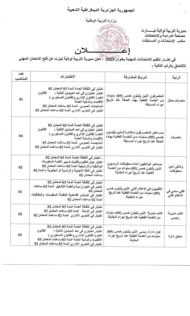 تعلن مديرية التربية لولاية تيارت.عين تيموشنت عن فتح مسابقات توظيف للالتحاق بالرتب التالية