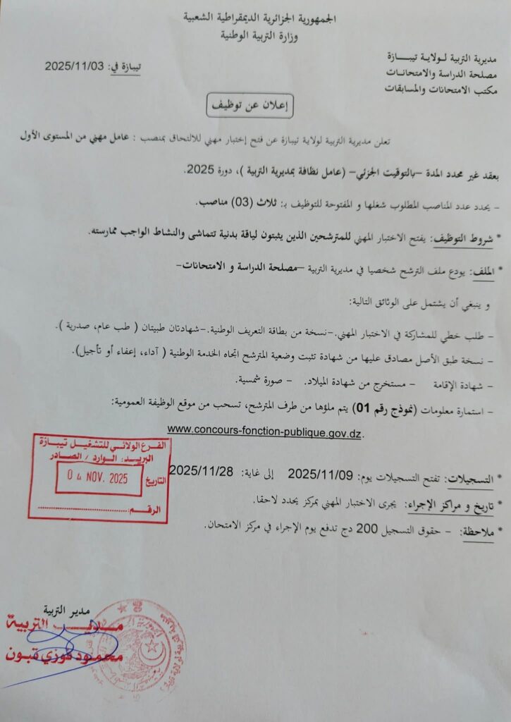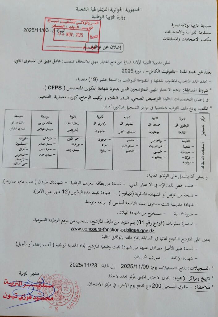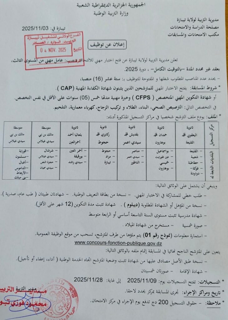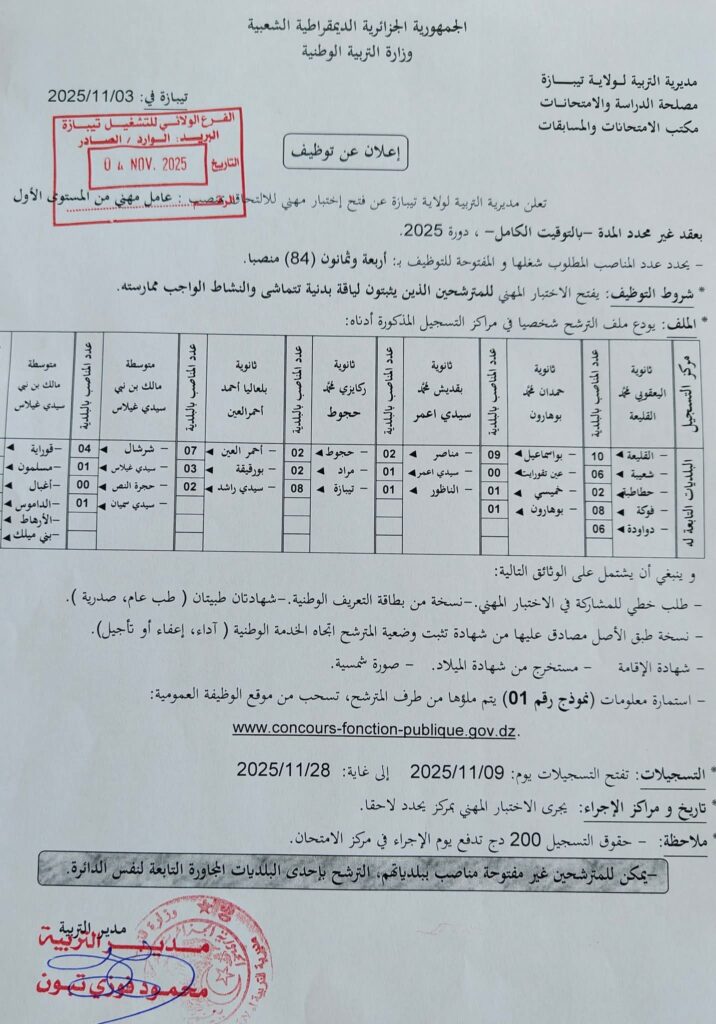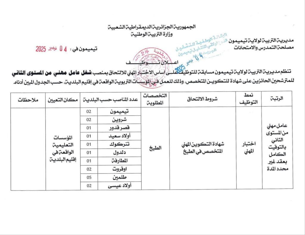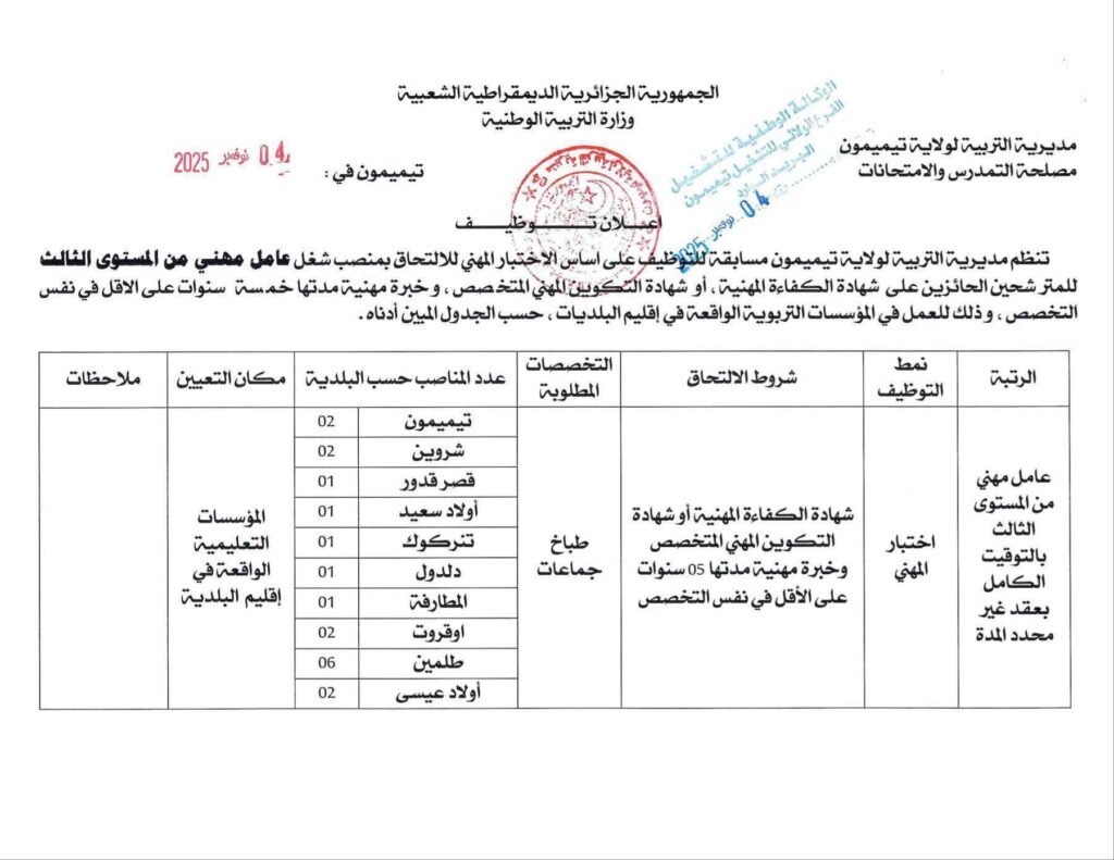 تعلن مديرية التربية لولاية أم البواقي وتميمون وتيبازة عن فتح مسابقات توظيف على أساس الاختبار المهني للالتحاق بالرتب التالية