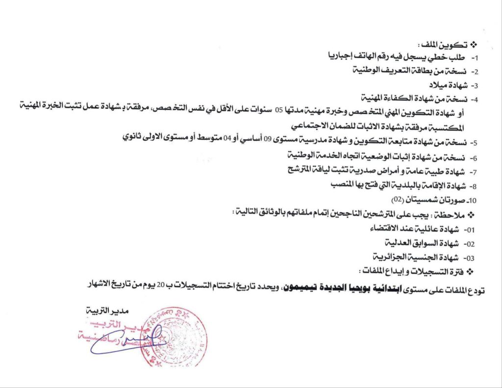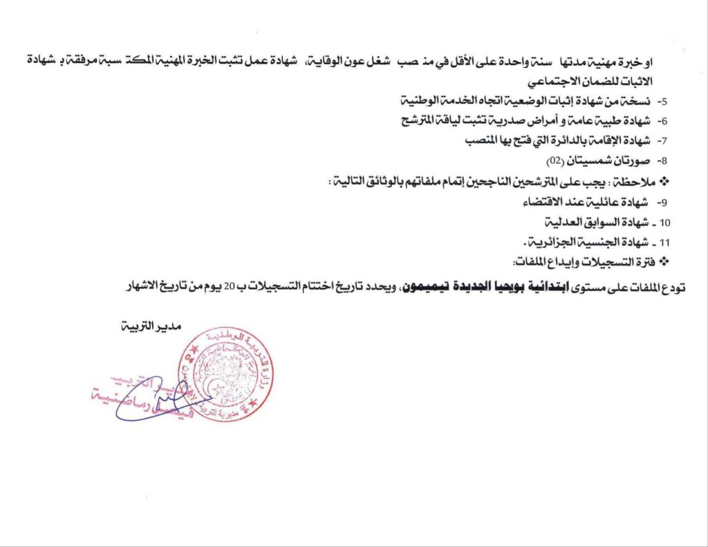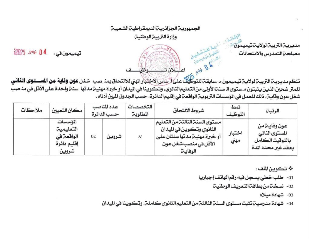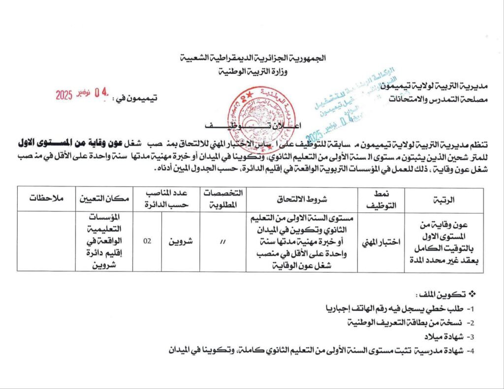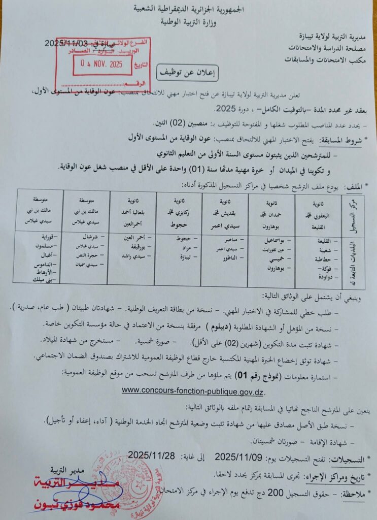 تعلن مديرية التربية لولاية أم البواقي وتميمون وتيبازة عن فتح مسابقات توظيف على أساس الاختبار المهني للالتحاق بالرتب التالية