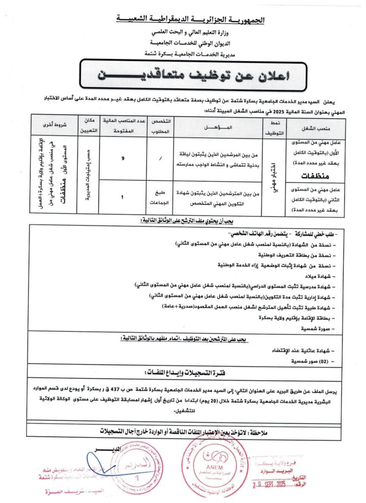 • مكان التعيين: حسب احتياجات مديرية الخدمات الجامعية بسكرة شتمة