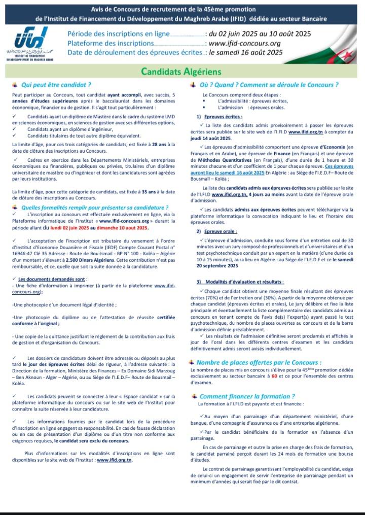 التسجيلات ستبدأ من 02 جوان حصريا عبر الموقع « www.ifid-concours.org » الى غاية 10 أوت 2025 .