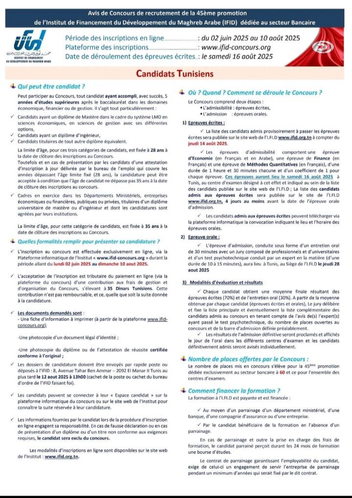 التسجيلات ستبدأ من 02 جوان حصريا عبر الموقع « www.ifid-concours.org » الى غاية 10 أوت 2025 .