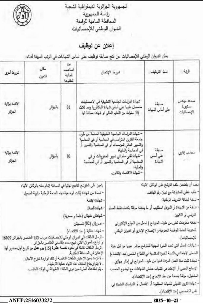 مسابقة توظيف بالديوان الوطني للإحصائيات