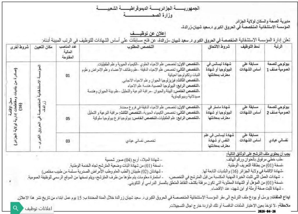 | نفساني عيادي | مسابقة على أساس الشهادات | شهادة ليسانس في علم النفس أو شهادة معترف بمعادلتها | تخصص نفساني عيادي | 03 | المؤسسة الاستشفائية المتخصصة في الحروق الكبرى – زرالدة | – |