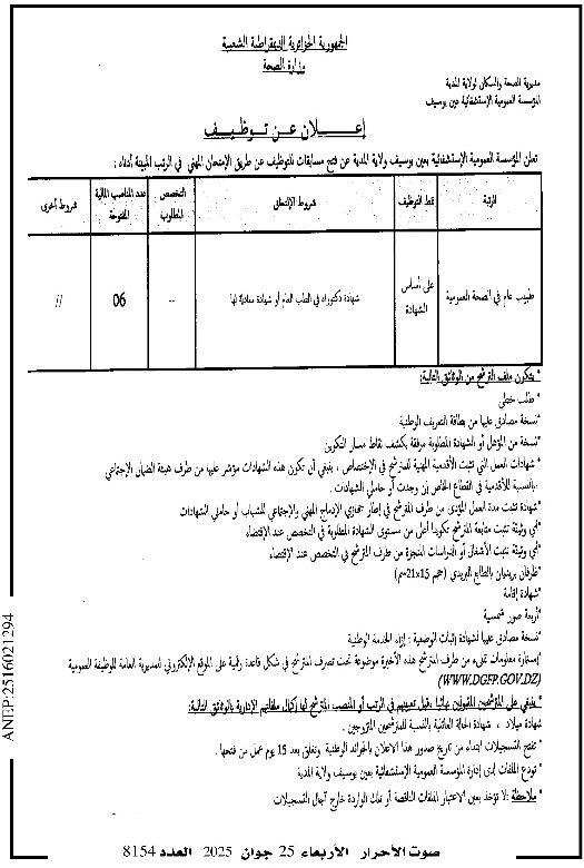تُعلن المؤسسة العمومية الاستشفائية بعين بوسيف – ولاية المدية عن فتح مسابقة للتوظيف عن طريق الامتحان المهني في الرتبة التالية: