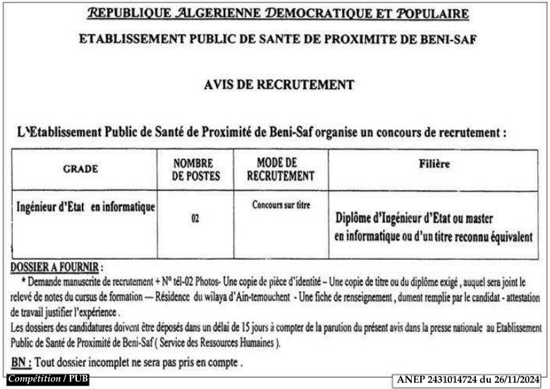 يجب إيداع الملفات في المؤسسة العمومية للصحة القريبة بني صاف، قسم الموارد البشرية، في أجل أقصاه 15 يومًا ابتداءً من تاريخ نشر هذا الإعلان في الصحافة الوطنية.
