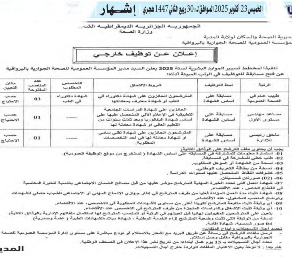 يُعلن السيد مدير المؤسسة العمومية للصحة الجوارية بالبرواقية عن فتح مسابقة توظيف خارجي في الرتب المبينة أدناه: