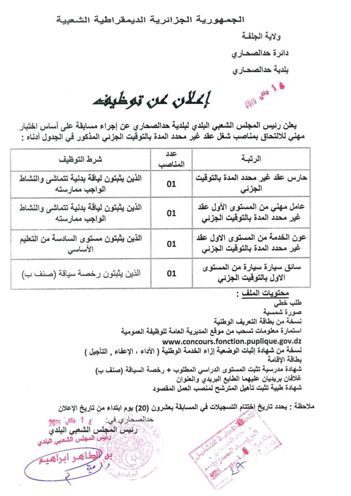 يُعلن رئيس المجلس الشعبي البلدي لبلدية حد الصحاري عن تنظيم مسابقة على أساس الاختبار المهني للتوظيف في مناصب شغل بعقد غير محدد المدة وبتوقيت جزئي، وفق التفاصيل التالية: