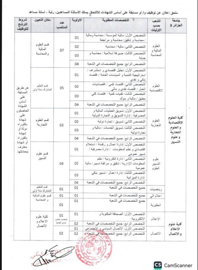 تعلن جامعة الجزائر 3 عن مسابقة توظيف على أساس الشهادات بعنوان سنة 2025، للالتحاق برتبة أستاذ مساعد قسم “ب”، وذلك حسب التخصصات المدرجة في الجدول المُلحق بالإعلان الرسمي.
