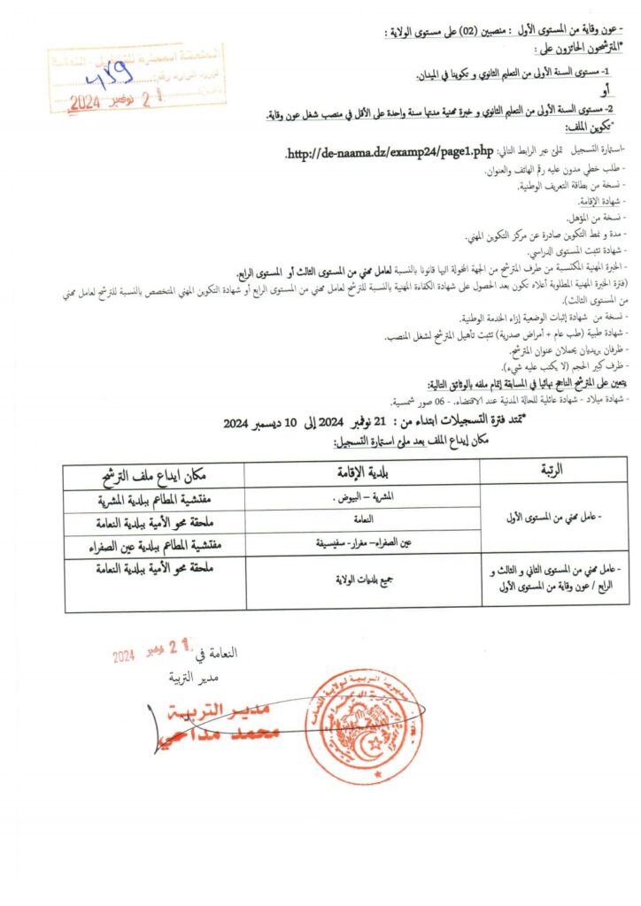 • استمارة التسجيل: يتم تعبئتها عبر الرابط التالي: http://de-naama.dz/examp24/page1.php.