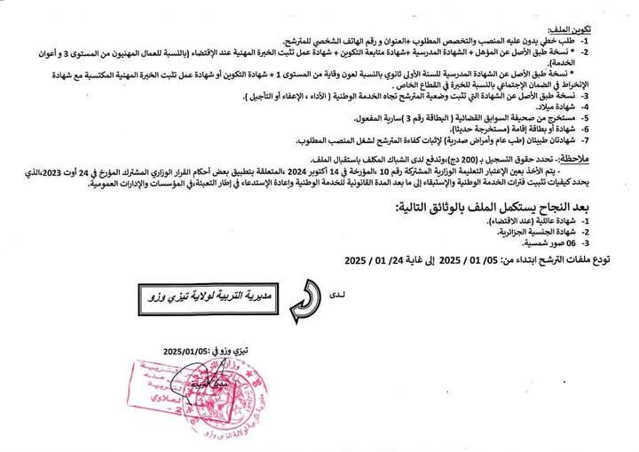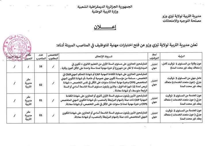 تعلن مديرية التربية لولاية تيزي وزو عن فتح اختبارات مهنية للتوظيف في المناصب التالية: