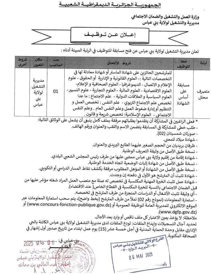 متصرف محلل مسابقة على أساس الشهادة للمترشحين الحائزين على شهادة الماستر أو شهادة معادلة لها في التخصصات التالية: – العلوم القانونية والإدارية أو الحقوق – علوم اقتصادية – العلوم المالية – العلوم التجارية – علوم التسيير – العلوم السياسية والعلاقات الدولية – علم الاجتماع؛ ما عدا تخصص علم الاجتماع التربوي – علم النفس؛ تخصص العمل والتنظيم أو إدارة ضغوط العمل وعلم النفس العام – وعلم النفس الاجتماعي – العلوم الإسلامية؛ تخصص شريعة وقانون. 01 مديرية التشغيل لولاية بني عباس