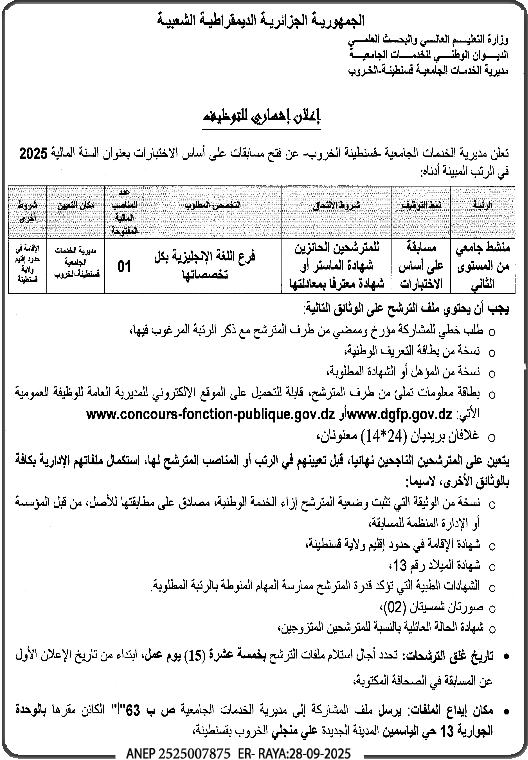 تعلن مديرية الخدمات الجامعية قسنطينة الخروب عن فتح مسابقة توظيف على أساس الاختبارات بعنوان السنة المالية 2025 في الرتبة المبينة أدناه: