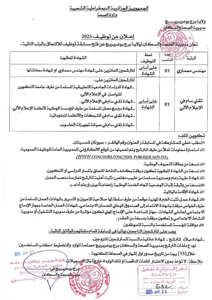 مسابقة توظيف بمديرية الصحة والسكان لولاية برج بوعريريج