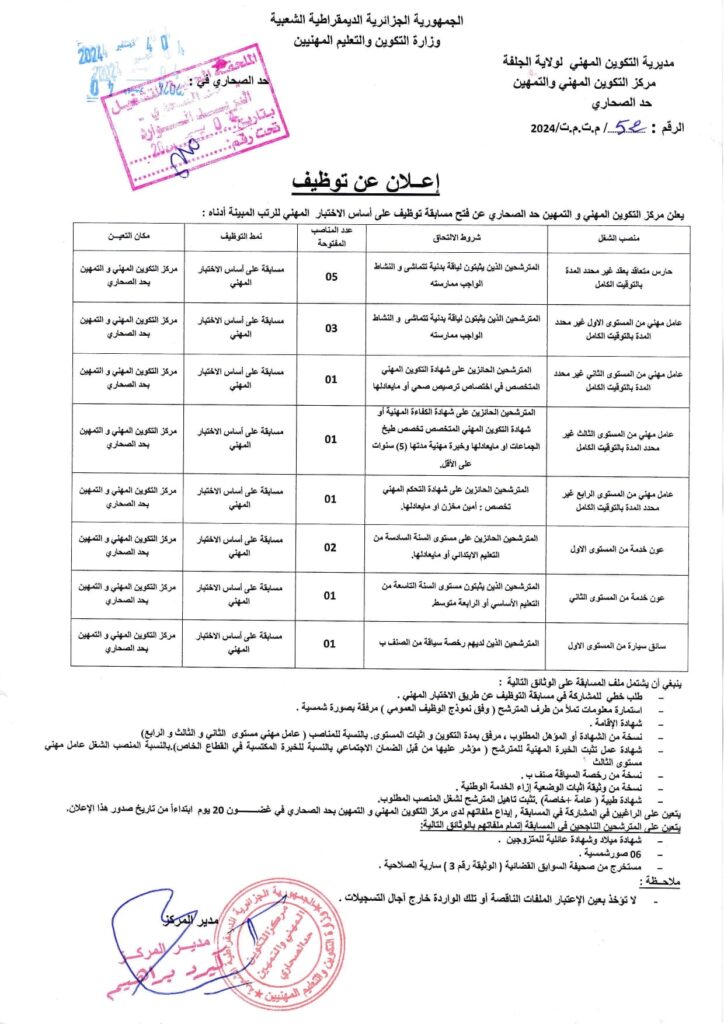 عون خدمة من المستوى الأول المترشحون الحائزون على مستوى السنة السادسة من التعليم الابتدائي أو ما يعادلها 01 مسابقة على أساس الاختبار مركز التكوين المهني والتمهين حد الصحاري