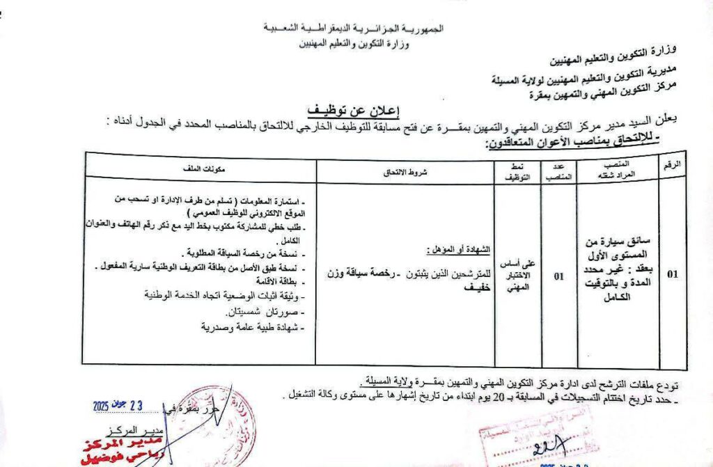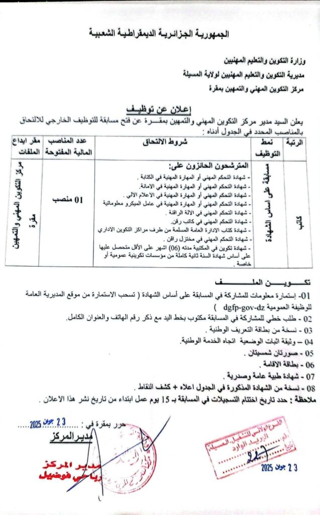 مكان إيداع الملفات: مركز التكوين المهني والتمهين بمقرة – ولاية المسيلة