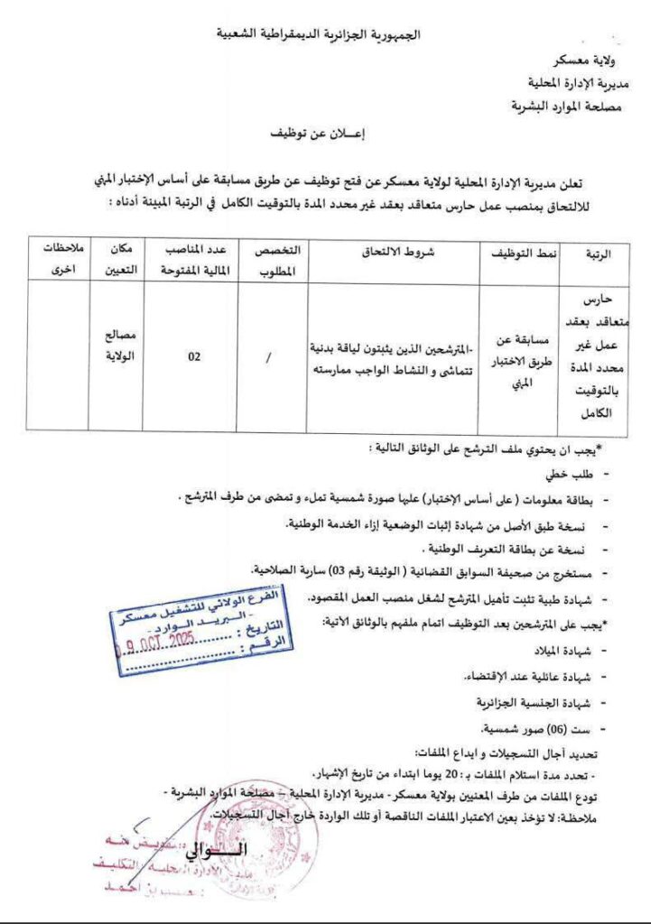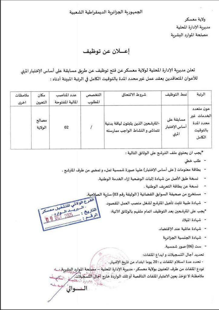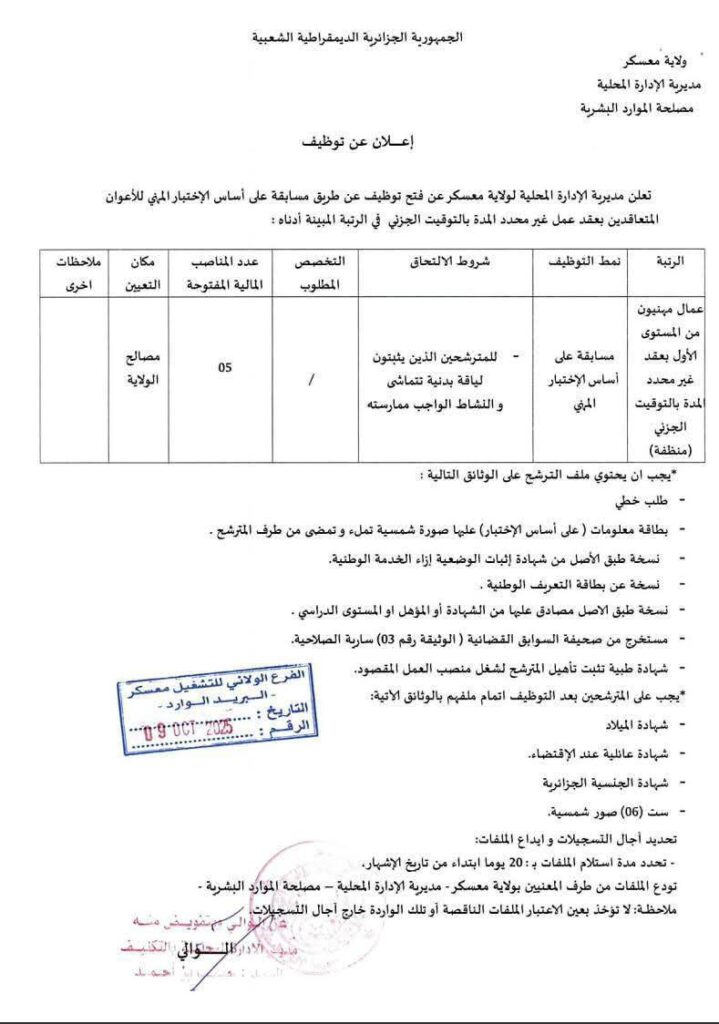 تعلن مديرية الإدارة المحلية لولاية معسكر عن فتح توظيف عن طريق مسابقة على أساس الإختبار المهني للأعوان المتعاقدين بعقد عمل غير محدد المدة بالتوقيت الجزئي في الرتبة المبينة أدناه :