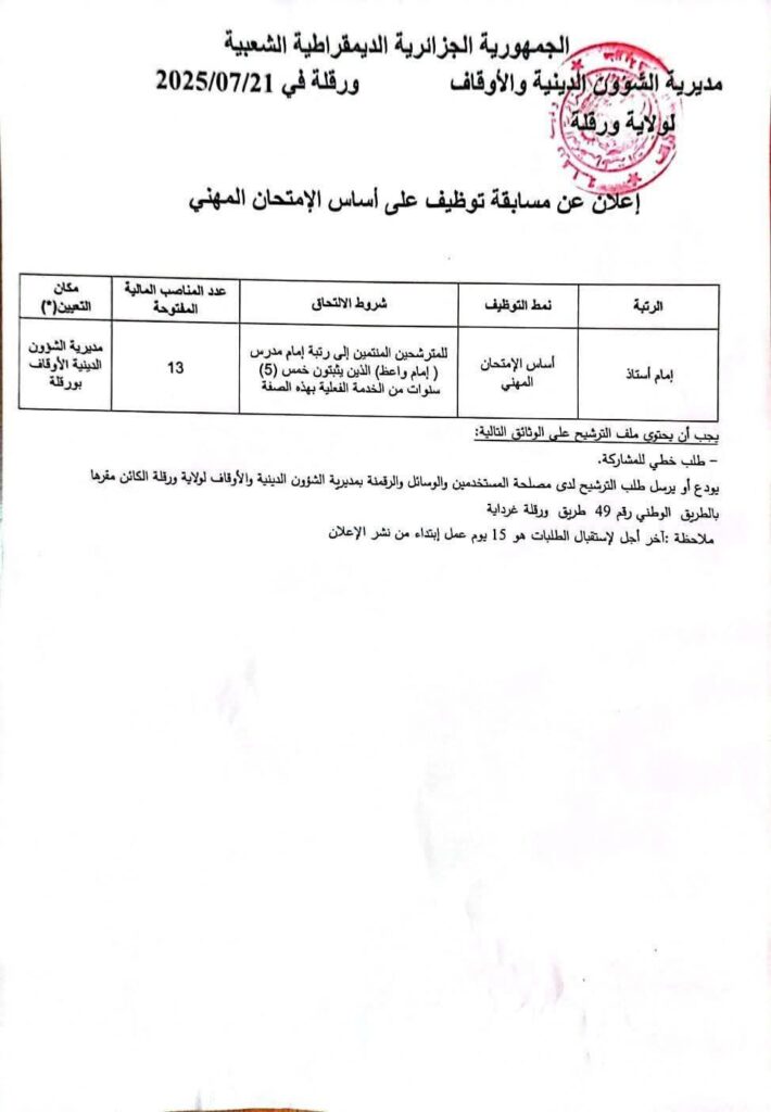مسابقة توظيف على أساس الامتحان المهني في رتبة إمام أستاذ 13 منصب