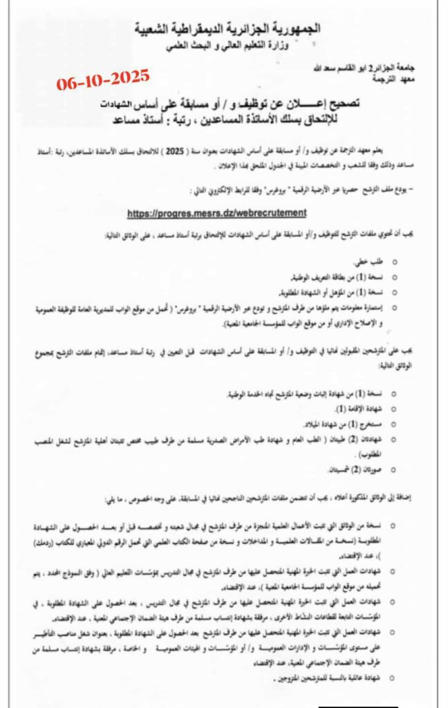 - يودع ملف الترشح حصرياً عبر الأرضية الرقمية “بروغرس” وفق الرابط الإلكتروني التالي: https://progres.mesrs.dz/webrecrutement