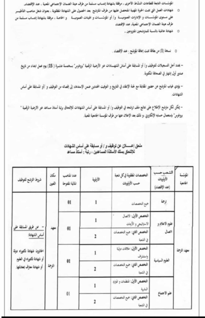 يعلن معهد الترجمة عن توظيف و/أو مسابقة على أساس الشهادات بعنوان سنة 2025 للالتحاق بسلك الأساتذة المساعدين، رتبة: أستاذ مساعد وذلك وفقاً للشروط والتخصصات المبينة في الجدول الملحق بهذا الإعلان.