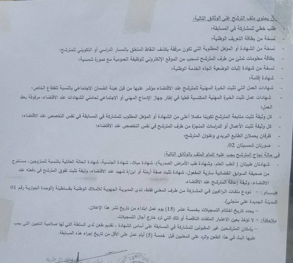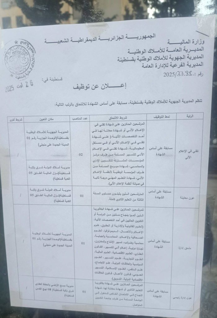 مسابقة توظيف على أساس الشهادة بالمديرية الجهوية للأملاك الوطنية بقسنطينة