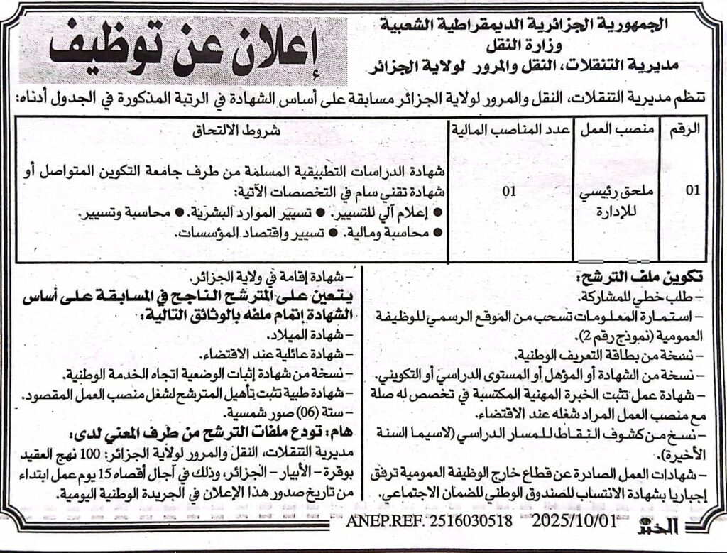 تعلن مديرية التنقلات والنقل والمرور لولاية الجزائر عن تنظيم مسابقة على أساس الشهادة للالتحاق بالرتبة المبينة في الجدول أدناه: